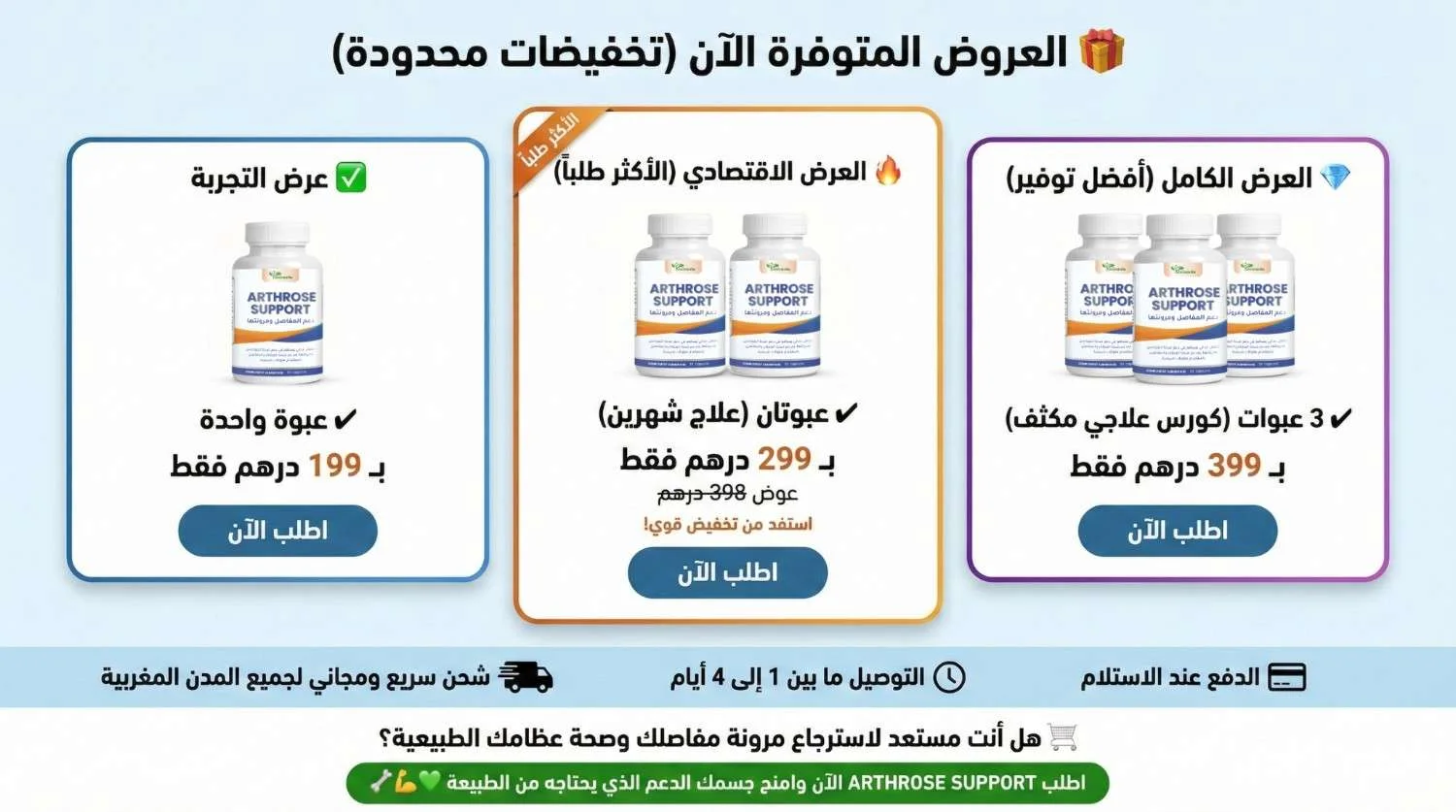 ما تتسناش حتى يزيد الألم! ARTHROSE SUPPORT كيوفر ليك التركيبة المثالية لدعم كثافة العظام وليونة المفاصل. هو الرفيق اليومي ديالك باش تحافظ على هيكلك العظمي قوي وصحي لسنوات طويلة.