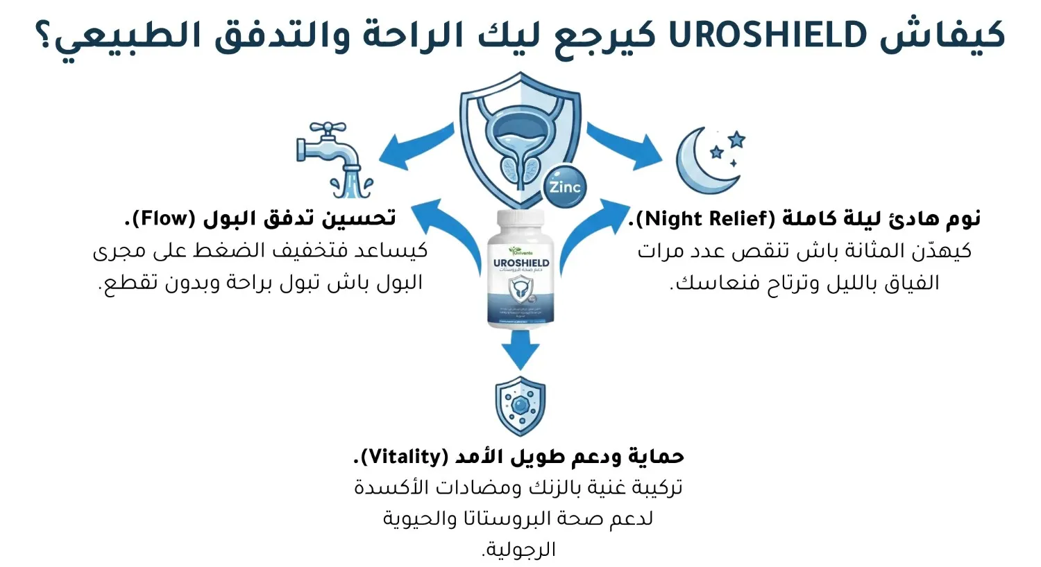 UROSHIELD هو "الدرع الواقي" ديالك. تركيبة علمية مركزة بالزنك والنباتات الطبية باش ترجع ليك الراحة والسيطرة.